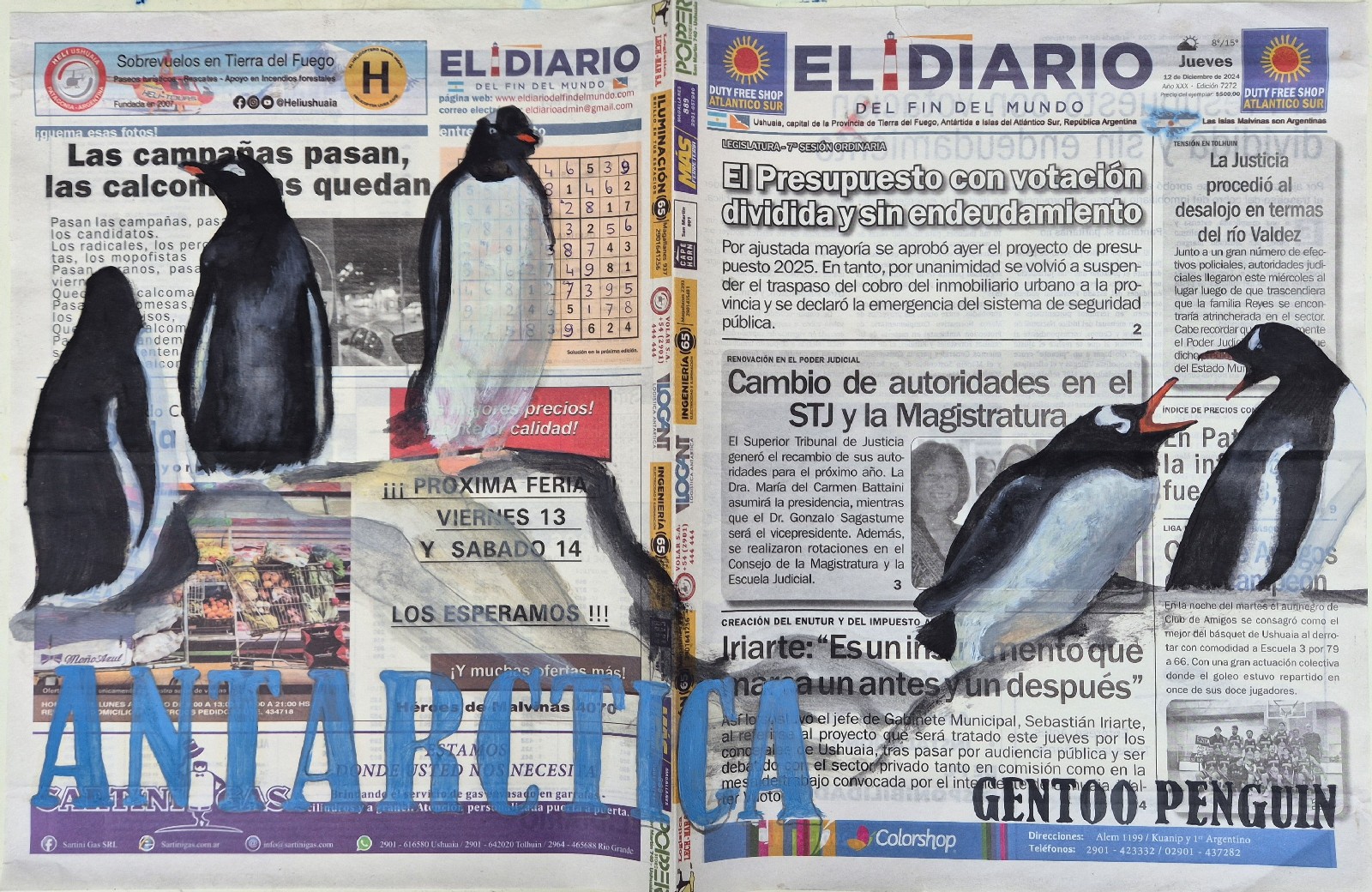 Met onze nieuwe jaarpas voor alle Nationale Parken van Argentinië rijden we naar het Nationaal park Tierra del Fuego. Het ligt een half uurtje rijden buiten Ushuaia. Er is maar één plekje waar je mag kamperen maar dat maakt niet uit. Het is een mooie spot langs een riviertje en het is lekker rustig. We hebben een rustige tijd. Ik klus wat aan de auto, maak o.a. een interval schakelaar met drie standen voor de ruitenwissers. Bien doet de was, leest een boek en schildert op een krant (El Dario del Fin del Mundo) de pinguïns van Antarctica. We wandelen veel en spotten weer veel vogels (o.a. een roze met paarse “disco duck” ) en een vos.