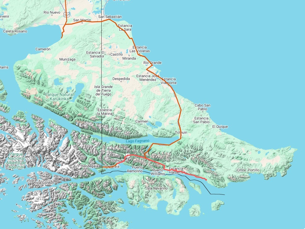 De volgende morgen volgen we de weg langs het Beagle Channel. We zijn te zwaar voor een brug, dus gaan we door het water Onderweg spotten we nieuwe vogels en zien een glimp van een paar grote zeehonden. Eigenlijk zijn we op zoek naar twee konings pinguïns die hier zouden moeten zitten maar die laten zich niet zien. Op de plek waar de weg stopt is geen mooie plek om te kamperen dus rijden we een stukje terug en vinden een leuk plekje met uitzicht over een kleine baai. Vlak langs de weg maar dat maakt niet uit. Als hier vijf auto’s per dag passeren is het een drukke dag. Tegen de avond worden we getrakteerd op een prachtige zonsondergang.